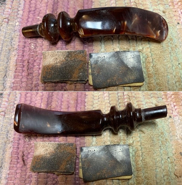 I set the bowl aside and turned to work on the stem. I sanded the stem surface to remove the scratches, Dremel marks and casting marks and blend them into the surface of the vulcanite with 220 grit sandpaper and started the polishing of the stem with 400 grit wet dry sandpaper.