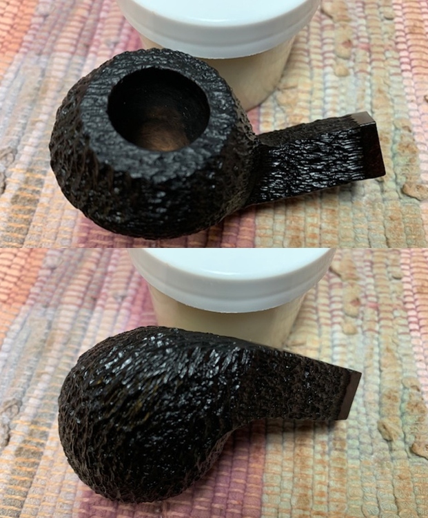 He took a photo of the bowl and rim top to show their general condition. You can see the thick lava on the rim top and the thick cake in the bowl. The damage on the rear inner edge of the bowl and the rear outside edge of the rim is very visible. The stem is oxidized, calcified and has tooth marks and chatter on both sides near the button and on the button surface.