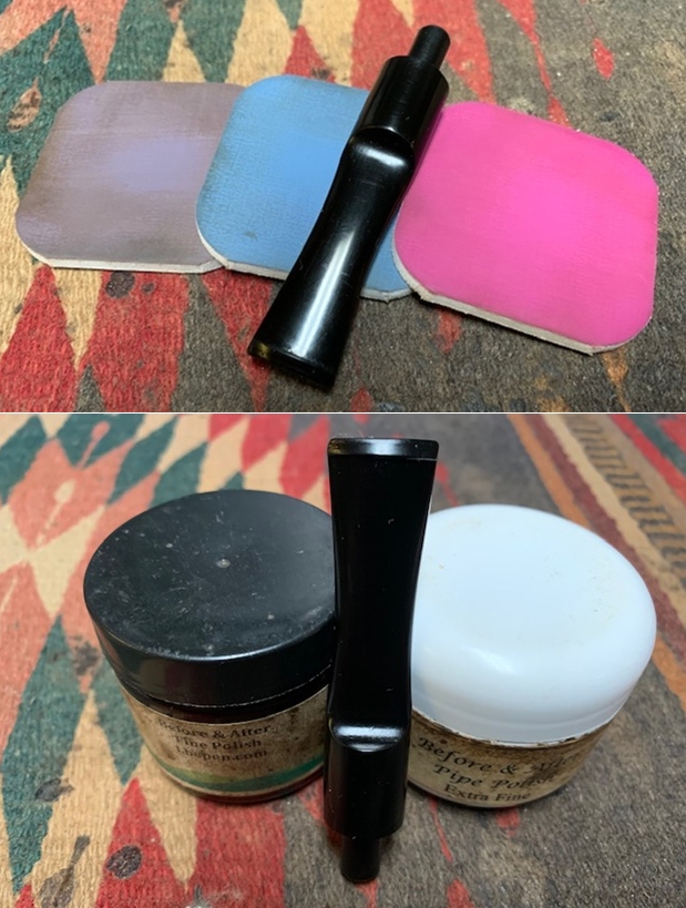 I polished the vulcanite stem with micromesh sanding pads – 1500-12000 grit pads. I wiped it down with a damp cloth after each sanding pad. I used Before & After Pipe Polish – both Fine and Extra Fine to further polish the stem.