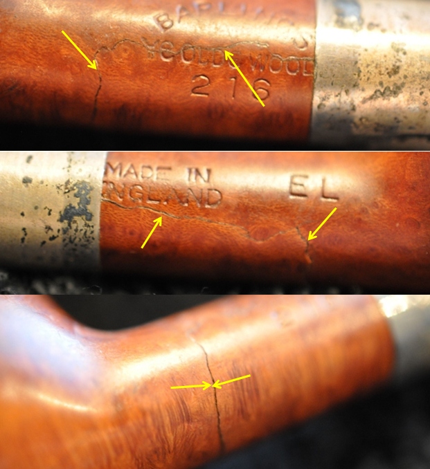 The above photos also show the crack in the shank. I am including them again so you can see the downward turn on the crack on each side and the way that it crosses the underside of the shank forming a U-shaped crack that certainly came free from the shank. It had obviously been glued back in place and then the Sterling Silver band had been glued in place on the shank end to bind it all together. I have inserted yellow arrows in the photos below to identify the path of the crack.