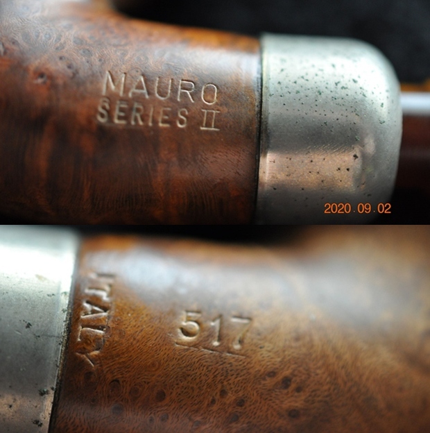 The next pipe on the work table came to us from a pipe hunt that Jeff and his wife recently did in Utah, USA. The pipe is an interesting pipe that looks like an Italian take on a Peterson’s System pipe. The pipe is well shaped and has nice grain around the bowl. The pipe is stamped on the left side of the shank and reads Mauro [over] Series II. On the right side it reads Italy along the ferrule edge and the shape number 517. There was a lot of grime ground into the smooth and finish on the briar. The bowl was heavily caked with a light overflow of lava on the top and inner edge of the rim. The inside edges looks like it may have burn damage on the front right. The variegated brown/gold/yellow acrylic stem had tooth chatter and marks on the top and underside near the button and on the button edge. There was a circle on the topside of the saddle stem that had a brass outer ring and an inner white acrylic insert. The stem did not seat all the way in the shank and would need to be addressed. It had promise but it was very dirty. Jeff took some photos of the pipe before he started his cleanup work. He took photos of the rim top and bowl to give a clear picture of the thickness of the cake and tobacco debris as well as the lava on the inner edge of the rim. He also took photos of the top and underside of the stem to show the chatter and tooth marks.   Jeff took photos of the sides and heel of the bowl to give a picture of what the briar looked like. It truly has some nice grain – birdseye and cross grain around the bowl and shank. The nickel ferrule is oxidized and dull.   The stamping on the shank sides is clear and readable and read as noted above. I turned to Pipephil (http://www.pipephil.eu/logos/en/logo-m4.html) to get a quick view of the brand once again. The site definitively links the brand to Mauro Armellini. The screen capture I included below shows a brief history of the brand. There was a link on the section to a page comparing the Peterson P-lip with its Armellini variant (http://www.pipephil.eu/logos/en/infos/p-lip-en.html). I included the section on the pipe stem below as a screen capture. It is fascinating to compare the stem to the many Peterson’s System pipes that I have worked on.I turned to Pipedia (https://pipedia.org/wiki/Armellini) for a quick read. The site referred me automatically from the Italian Makers list to Mauro Armellini. The write up is very well done and gives a great amount of history. It is worth a read.