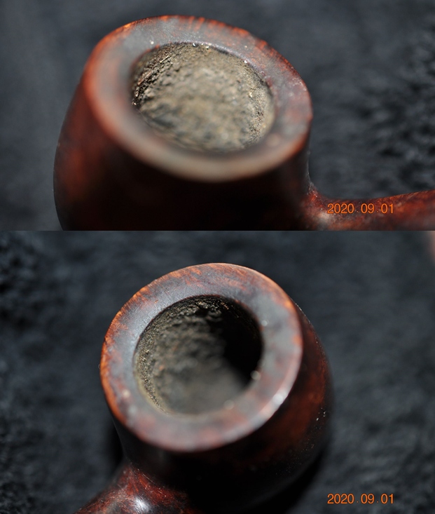 He took photos of the rim top and bowl to give a clear picture of the thickness of the cake and tobacco debris as well as the inner edge of the rim. He also took photos of the top and underside of the stem. The photos show the overall condition of the stem. The stem had four light blue dots on the left side of the taper.