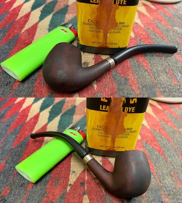 I sanded the bowl smooth with 1500-3200 grit micromesh sanding pads (I forgot to take photos of that process). I stained the pipe with a dark brown aniline stain, flamed it to set it in the grain and repeated the process until I was happy with the coverage.