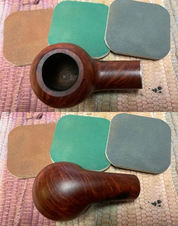 I polished the top of the bowl, the repaired areas and the entirety of the bowl with micromesh sanding pads – wet sanding with 1500-12000 grit pads and wiping the briar down with a damp cloth after each sanding pad.