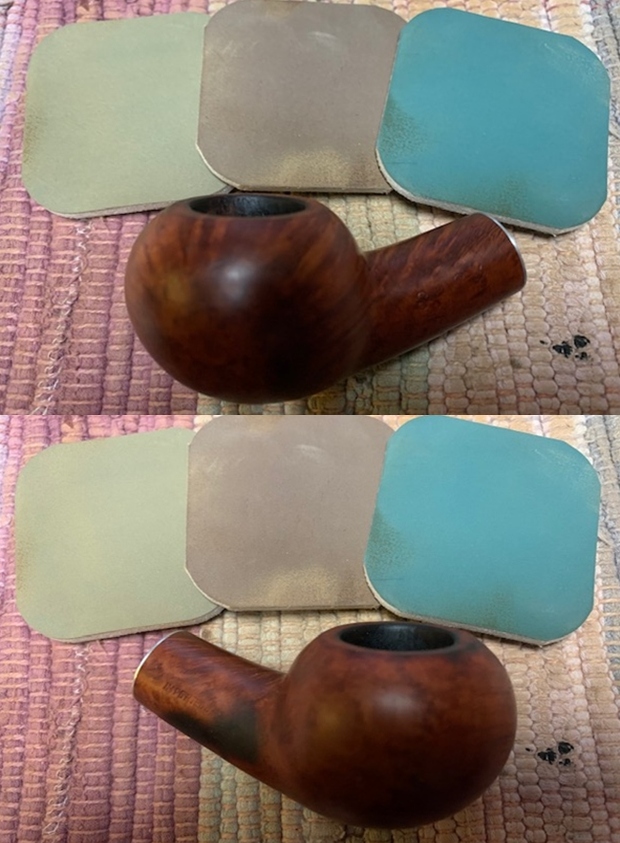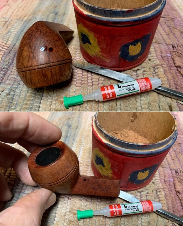 I took photos of the fills on the right front of the bowl side and the left top of the shank. They were like pink circles. They were indented so I filled them in with super glue and briar dust. Once the repairs cured I sanded them smooth with a folded piece of 220 grit sandpaper.