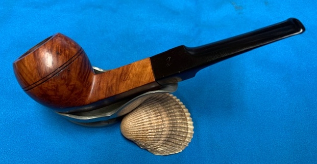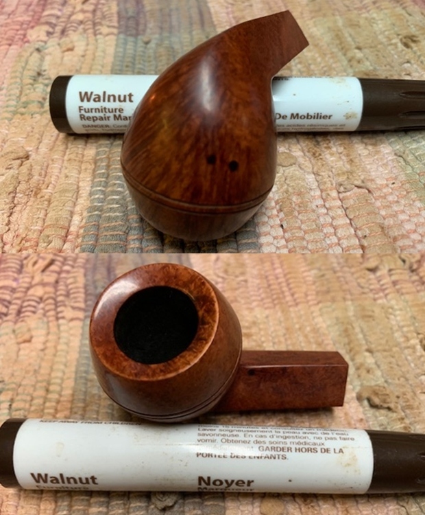 I sanded the lighter spots around the fills with a Walnut stain pen to blend it into the surrounding briar.