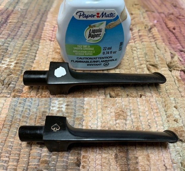 I set the bowl aside and turned my attention to the stem. The Waldorf Spade logo on the left topside of the saddle stem was worn so I touched it up with Liquid Paper. Once it dried I scraped it off and took a photo.