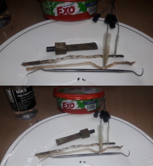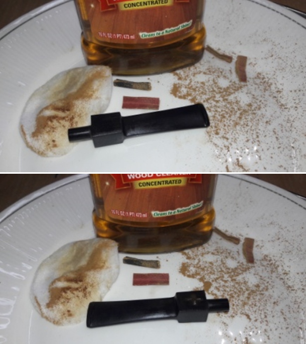 Next she cleaned out the internals of the stem air way using hard and regular pipe cleaners dipped in isopropyl alcohol. She cleaned the stem surface under running warm water and scrubbed the surface oxidation from the stem using Scotch Brite pad and dish washing soap. The aluminum stinger was also similarly cleaned. She further removed the oxidation by scrubbing the stem with 0000 grade steel wool and applied a little olive oil to rehydrate the stem.