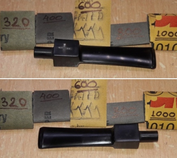 I further sand the stem surface with 320 followed by 400, 600 and 800 grit sandpapers. I finished the sandpaper cycle by wet sanding the entire stem surface with a piece of 1000 grit sandpaper. I wiped the stem with a moist cloth to remove the sanding dust and applied a small quantity of EVO to hydrate the stem.