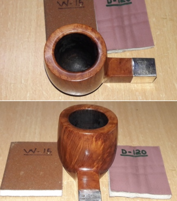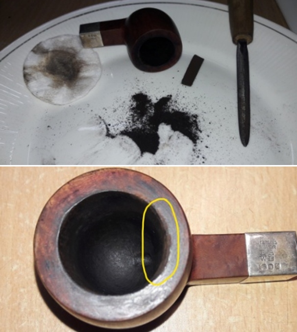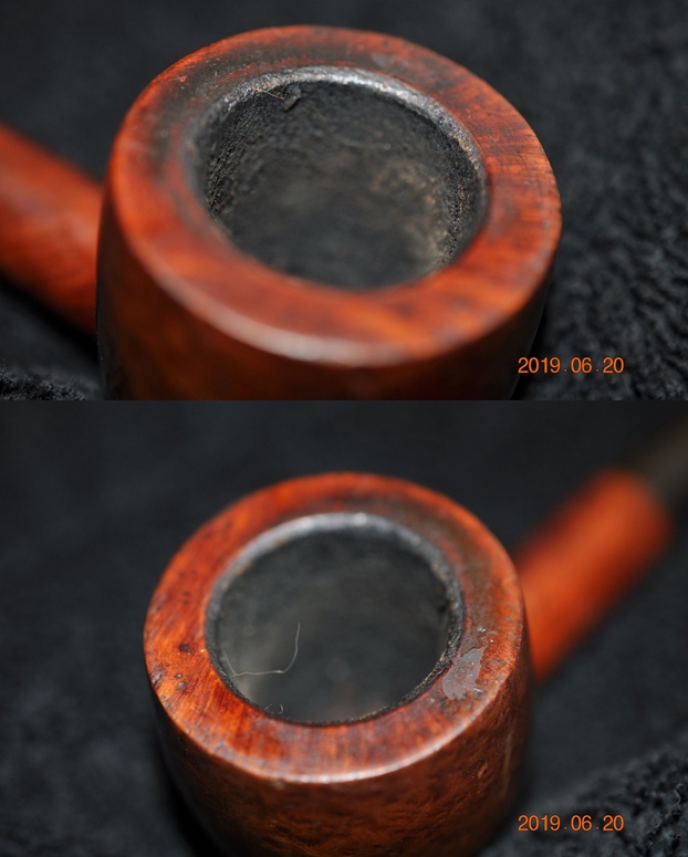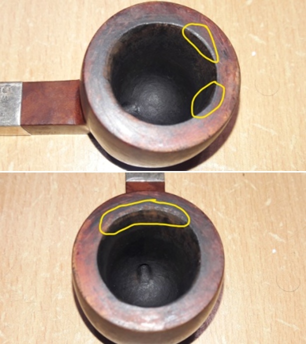This pipe has a rather small bowl in a classic Dublin shape and has a chamber depth of about 1.1 inches. The chamber had an even layer of dry flaky cake which is not very thick. The condition of the inner walls of the chamber can be commented upon after the cake has been taken down to the bare briar. The rim top surface was covered in overflowing lava. The inner rim edge has minor charring in 6 o’clock and 11 o’clock directions (encircled in pastel blue) with some minor dings all along the edge. The outer rim edge is mysteriously darkened in the 12 o’clock direction. The draught hole is clogged and restricts the free flow of air through it. The ghost smells in the chamber are very mild.