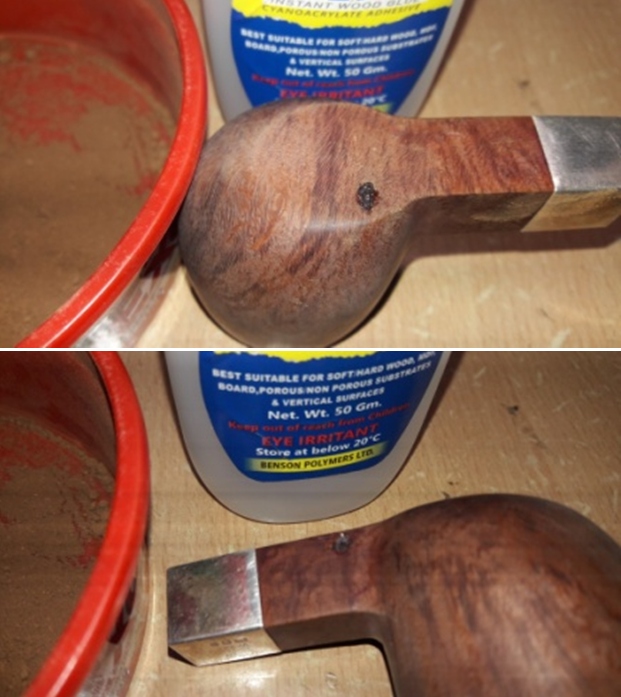 Next I addressed the issues of the two fills in the stummel surface. With a sharp dental tool, I gouged out the fill on the right side of the stummel and one on the left side of the shank. Using the layering method, I filled these gouges with a mix of briar dust and CA superglue till the mound of the mix was slightly above the rest of the stummel surface. This helps in a better blending of the fill with the rest of the stummel surface while sanding and reduces the scratches caused by the use of a needle file since you have a correct perspective of the sanding that is required. I set the stummel aside for the fills to cure.