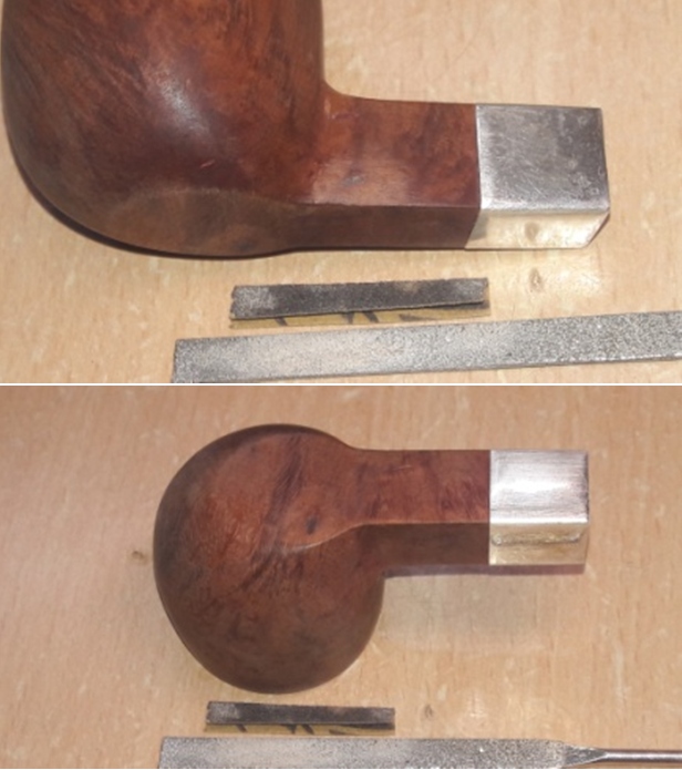 Using a flat needle file, I sand the fill till I had achieved a rough match with the surrounding stummel surface. I sand the entire stummel with a piece of 220 grit sand paper to further blend in the fills with the stummel surface.