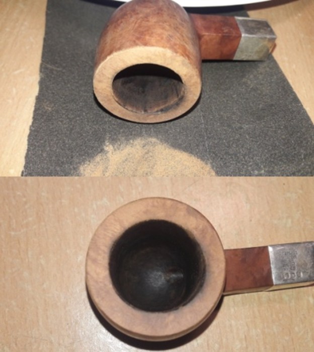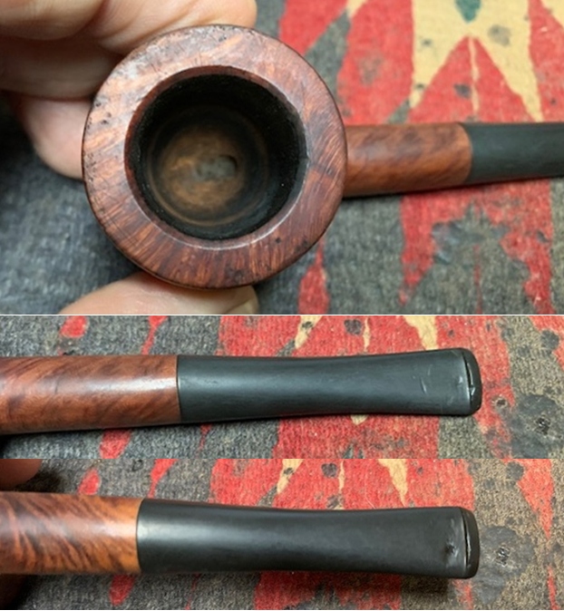 To be honest, the pipe had cleaned up nicely. What she thought was unclean stummel was in fact the old lacquer coat that had come off in patches. The two fills, encircled in yellow, are now plainly visible. The right side of the stummel shows a few dents/ dings. The aluminum spacer ring at the shank end is greatly oxidized and would need to be polished to a nice shine. The mortise is nice and clean. Sanding the stummel surface with a piece of 220 grit sand paper should address the issue of dings to a great extent. Once the stummel has been completely scrubbed and free of the old lacquer, I shall refresh the fills with a mix of briar dust and superglue. A vigorous scrub with Scotch Brit pad and Murphy’s Oil soap should suffice to remove the old peeling lacquer coat. In case this does not work, a wipe with pure Acetone on a cotton swab will definitely address this issue. After the aluminum spacer ring has been polished, it will provide a nice bling to the overall appearance of the pipe.