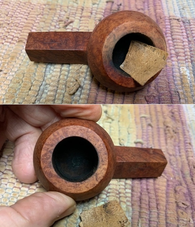 The chamber walls are sans any damage. The inner rim edge is in good condition save for light charring (encircled in green) and a chip (encircled in blue). The outer rim edge shows just a hint of darkening in 1 o’clock direction, but otherwise in excellent condition. The rim top surface is uneven to the touch. The draught hole is dead center and at the bottom of the heel and this construction geometry should make this pipe a fantastic smoker. Topping the rim surface should address the issues of uneven rim top, the charred outer rim edge while greatly reducing the inner rim edge damage. I shall, if need be, create a bevel to the inner edge to completely address the rim damage.