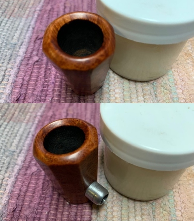 I decided to start my work on this pipe by separating the shank extension and the stem. I put it in the freezer overnight and it had no effect. It was still stuck. I used a folded pipe cleaner to drizzle acetone down the joint of the extension and the stem. I continued that process for the better part of a day. Finally last evening I was able to wiggle the stem free from the extension. Both were incredibly dirty at the junction. It was going to take a bit of work to get a clean fit.