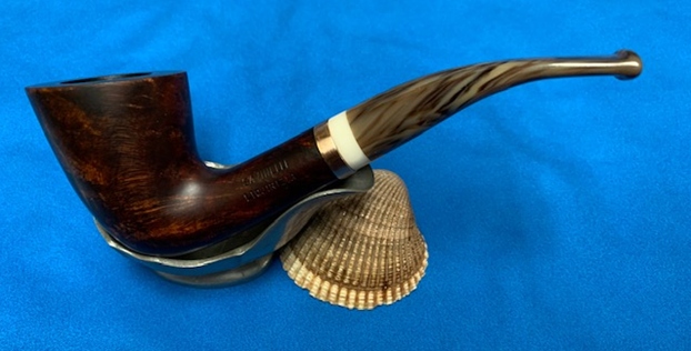 This nicely grained Savinelli Liquirizia 920KS Bent Dublin with a thin brass repair band and a swirled acrylic stem is a great looking pipe. The briar around the bowl is clean and really came alive. The rich brown stains gave the grain a sense of depth with the polishing and waxing. The grain really popped. The brass band binds the cracked shank repair and gives it a bit of bling. I put the acrylic stem back on the bowl and carefully buffed the pipe with Blue Diamond on the buffing wheel using a light touch on the briar. I gave the bowl and the stem multiple coats of carnauba wax on the buffing wheel. I buffed the pipe with a clean buffing pad to raise the shine. I hand buffed the pipe with a microfiber cloth to deepen the shine. The finished Savinelli Liquirizia Bent Dublin is a beauty and feels great in the hand and looks very good. Give the finished pipe a look in the photos below. The dimensions of the pipe are Length: 5 ½ inches, Height: 2 inches, Outside diameter of the bowl: 1 ½ inch, Chamber diameter: ¾ of an inch. The weight of the pipe is 44grams/1.55oz. The pipe will be going back to Zak as soon as finish the second one. He will soon, so he can enjoy it again. Thanks for reading this blog and my reflections on the pipe while I worked on it.