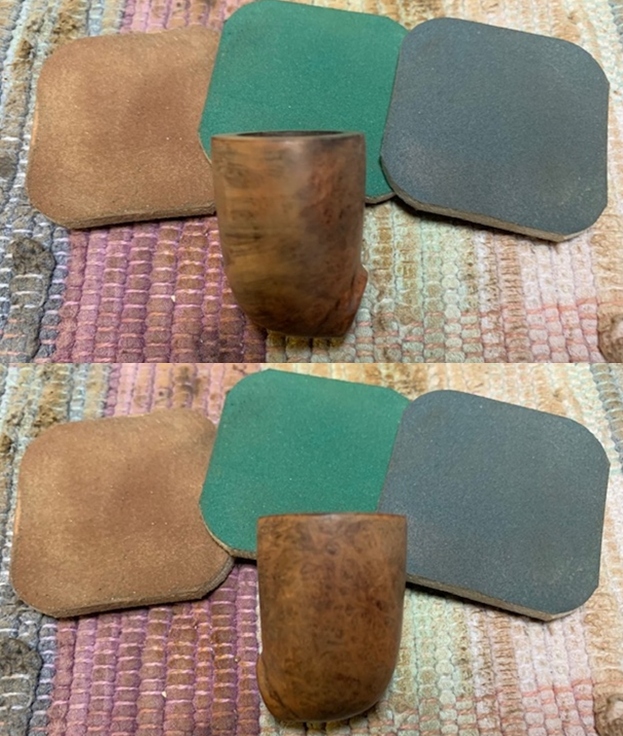 I started my work on the pipe by addressing some of the damage to the rim top edges. I topped the rim on a topping board with a piece of 220 grit sandpaper. I also flattened the area where the stem inserted into the bowl as it was damaged.