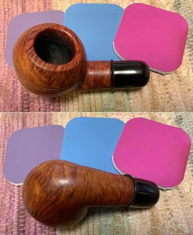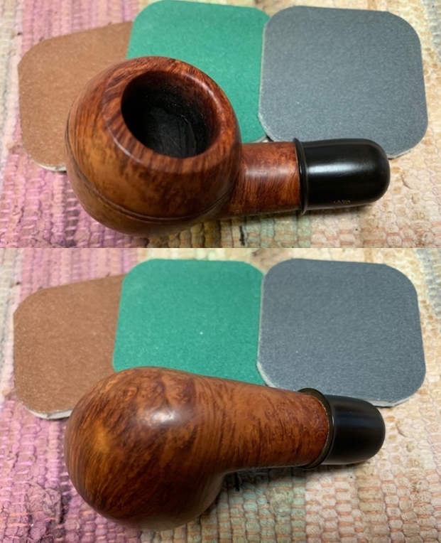Jeff had cleaned up the pipe with his usual penchant for thoroughness. He reamed the pipe with a PipNet Pipe Reamer and cleaned up the remnants with a Savinelli Fitsall Pipe Knife. He scrubbed the bowl with undiluted Murphy’s Oil Soap with a tooth brush. He worked over the debris on the rim top and was able to remove it. He rinsed it under running warm water to remove the soap and grime. He cleaned out the inside of the shank and the airway in the stem with alcohol, cotton swabs and pipe cleaners. He soaked the stem in Before & After Pipe Stem Deoxidizer and rinsed it off with warm water. He scrubbed the stem with Soft Scrub and cotton pads to remove remaining oxidation on the ferrule and the stem. He rinsed it with warm water and dried it off. I took photos of the pipe once I received it. It really looked good.