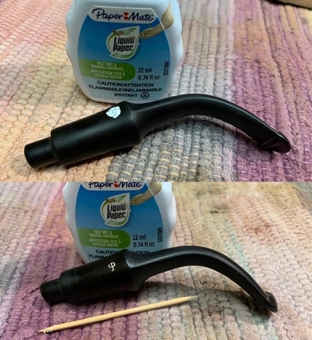 I touched up the “P” stamp on the left side of the stem with Paper Mate Liquid Paper. I applied it with the sponge in the bottle and worked it into the stamp with a tooth pick. Once it dried I scraped off the excess with the tooth pick. The stamp looks very good.