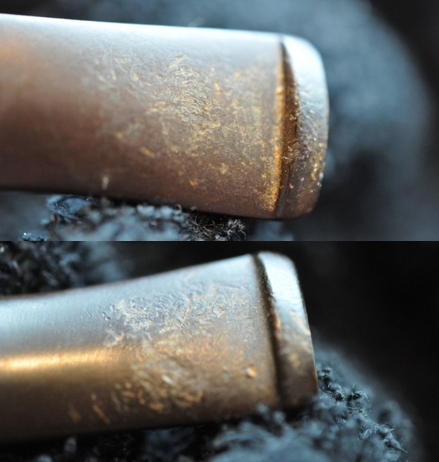 The plateau rim top and inner edge of the rim looked good. The stem surface looked very good with some light tooth marks and chatter on both sides near the button. It also had some residual oxidation.