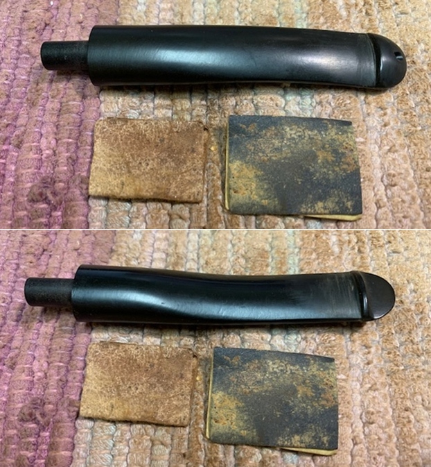 I set the bowl aside and turned my attention to the stem. I sanded out some tooth marks on the underside of the stem with 220 grit sandpaper. I started the polishing with 400 grit wet dry sandpaper. I wiped it down with some Obsidian Oil.