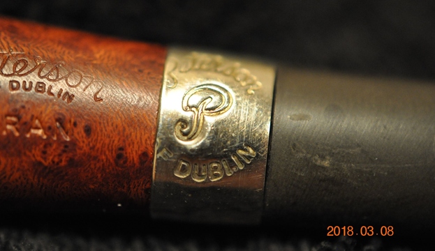 This Canadian came with a nice nickel band on the shank end that was factory fitted to the stamping on the shank. The grime was ground into the finish on the bowl sides. The contrast of the brown stains gave the grain a sense of depth. It was stamped on the topside of the shank and read Peterson’s [over] of Dublin [over] Aran. The right side had the shape number 264 stamped mid shank. The nickel band was stamped Peterson [over] a stylized P [over] Of Dublin. There was a moderate cake in the bowl but no overflow of lava on the rim top. The stem was lightly oxidized and had light tooth marks, chatter and scratches on the top and underside on and near the button. Jeff took photos of the pipe before his cleanup work. They tell the story and give a glimpse of the promise that we see in this pipe.