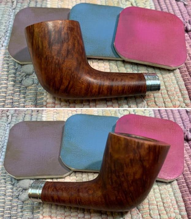 This Peterson’s Product “K” Briar 338 Bent Billiard with a vulcanite stem is a great looking pipe now that it has been restored. The beautiful grain that shines through the polished finish is stunning. I put the stem back on the bowl and carefully buffed the pipe with Blue Diamond on the buffing wheel. I gave the bowl and the stem multiple coats of carnauba wax on the buffing wheel and followed that by buffing the entire pipe with a clean buffing pad. I hand buffed the pipe with a microfiber cloth to deepen the shine. The grain just popped with the wax and the buffing. It is a beauty! The finished Peterson’s “K” Briar Bent Billiard 338 fits nicely in the hand and feels great. Give the finished pipe a look in the photos below. The dimensions of the pipe are Length: 5 inches, Height: 1 ¾ inches, Outside diameter of the bowl: 1 ¼ inches, Chamber diameter: ¾ of an inch. The weight of the pipe is 39gr/1.34oz. If you are interested in adding this pipe to your collection send me a message or an email. Thanks for reading this blog and my reflections on the pipe while I worked on it. There are many more to come!