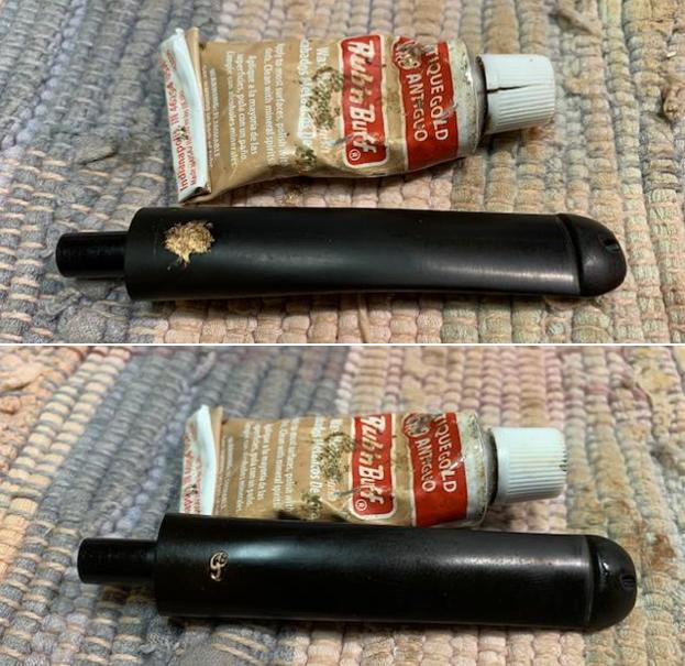 I set the bowl aside and turned my attention to the stem. Earlier in the day I had dropped the stem in a Deoxidizer Bath from Briarville and let it sit most of the day. Once I removed it from the bath it had soaked for about 5-6 hours. I removed it and wiped it down with a paper towel. I worked it over pretty roughly to remove the calcification and oxidation that sat on top of the vulcanite. It came out looking very good.