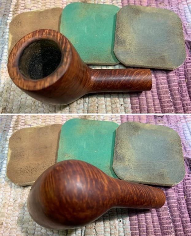 I decided to address the damage to the back edge of the bowl and the rim top first. I used a folded piece of 220 grit sandpaper to give the inner edge of the bowl a slight bevel to accommodate the burned areas and blend them into the surrounding briar. I also worked over the darkening on the rim top with the sandpaper.
