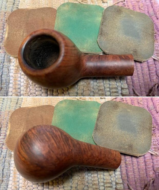 I decided to address the damage to the edge of the bowl and the rim top first. I used a folded piece of 220 grit sandpaper to give the inner edge of the bowl a slight bevel to accommodate the burned areas and blend them into the surrounding briar. I also worked over the darkening and nicks on the rim top with the sandpaper.