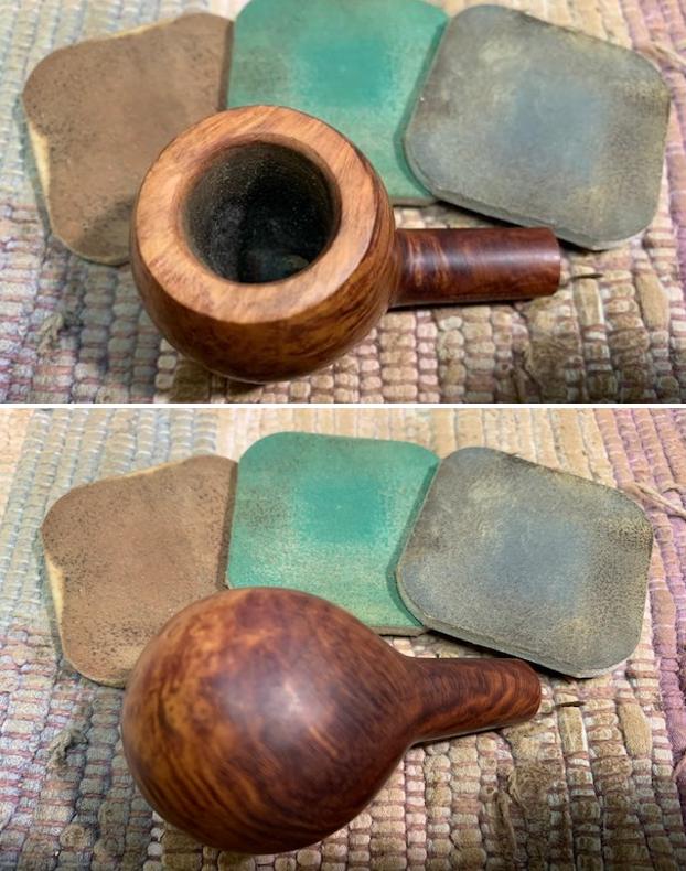 When the 20 minutes are completed, I wipe the excess Balm with a microfiber cloth and then buff up the surface. I like Mark Hoover’s Balm. It does a great job with the subtleties of the briar hues.