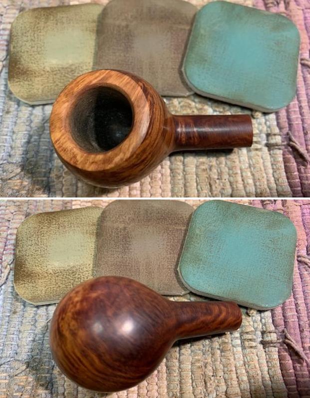 To encourage blending of the patches as well as to further clean the rim and bowl surface of small nicks and scratches, I employ sanding sponges. Sanding sponges are not as invasive as sanding papers and I use them to prepare for micromesh pad sanding. Starting first with a coarser grade, the rim is ‘topped’ along with sanding the entire stummel – careful to avoid the BC nomenclature on the shank. Following the coarser grade, medium and then a light grade sponges are used and complete this sanding phase.