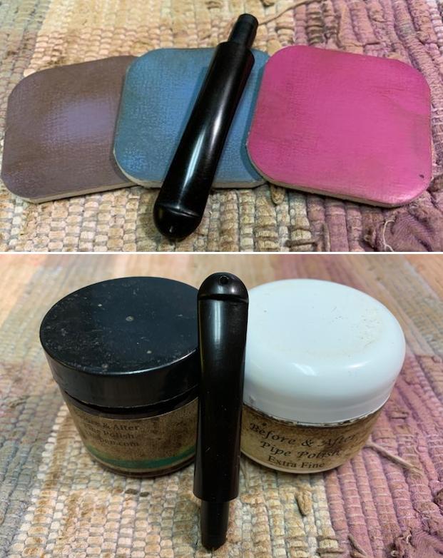 Following the steel wool, the stem is sanded with the full regimen of micromesh pads beginning by wet sanding with pads 1500 to 2400. Then, this is followed by dry sanding with pads 3200 to 4000 and 6000 to 12000. Between each set of 3 pads, Obsidian Oil is applied to the stem to condition and guard against oxidation. The finished stem has a nice pop to it and the tooth chatter and button repairs look good.
