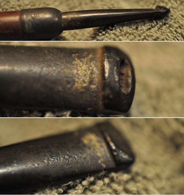 I took a photo of the picture that was included in the catalogue for the “GLOKAR” and have included it below. The cutaway diagram shows the system in the bowl and shank as well a the patented lip design. It is remarkably like a Peterson’s system pipe. One of the differences is the shape of the exit of the air way in the button. This one is a slot rather than a round hole.Now it was time to work on the pipe. Jeff carefully cleaned the pipe from top to stern. He reamed it with a PipNet pipe reamer and then cleaned up the reaming with a Savinelli Fitsall Pipe Knife. He scrubbed out the internals of the shank, stem and shank extension with alcohol, pipe cleaners and cotton swabs until the pipe was clean. He scrubbed the exterior of the bowl with Murphy’s Oil Soap and a tooth brush to remove the grime and grit on the calabash and the tarnish and lava on the rim top. The finish looks much better and has a deep richness in the colour that highlights grain of the briar. The rim top looked good with some darkening on the top and outer edge of the bowl. Jeff soaked the stem in bath of Before & After Deoxidizer to remove the oxidation on the rubber. He worked it over with Soft Scrub All Purpose Cleaner to remove any remnants of oxidation. When the pipe arrived here in Vancouver I was amazed it looked so good. Here are some photos of what I saw. I took some close up photos of the rim top and the stem surface. The rim top  was darkened but did not look otherwise damaged. There was also some darkening around the outer edge of the bowl that would need to be worked on. The silver ferrule was in great condition. I took close up photos of the stem to show the condition of the surface and button. I took a picture of the stamping on the shank. The reflection on the silver did not capture the stamping on the ferrule but it was all clear and readable as noted above.I took the pipe apart and took a photo of the pipe with the short stem. It is a good looking pipe and very unique. I started my work on the pipe by addressing the darkening on the edges and rim top. I used a folded piece of 220 grit sandpaper to work over the edges (inner and outer) and the crowned rim top to try to minimize the darkening. While not flawless I was happy with the results.I polished the rim top and the rest of the briar with micromesh sanding pads – dry sanding it with 1500-12000 grit pads. After each pad I wiped the briar down with a damp cloth.  I was able to give a shine to the bowl and remove some of the surface scratches in the process.  I worked some Before & After Restoration Balm into the surface of the bowl and shank with my fingertips to clean, enliven and protect the briar. I let the balm sit for 15 minutes and then buffed with a cotton cloth to raise the shine. The photos show the bowl at this point in the restoration process. I polished the silver ferrule with a jewelers cloth to remove any residual tarnish and also to protect it from future tarnish (at least for awhile). With that done the bowl was finished other than the final buffing. I set the bowl aside and turned my attention to the stem. I filled in the deep tooth marks against the button edge with clear super glue. Once it cured I sanded out the repairs and the tooth chatter on the stem with 220 grit sandpaper. I started the polishing with 400 grit wet dry sandpaper.    I filled in the Glokar Trademark stamping on the stem with Rub’n Buff Antique Gold to highlight the stamping. I rubbed it on and worked it into the stamp with a toothpick. I buffed it off with a cotton pad. The stamp looks really good at this point.I polished the stem with micromesh sanding pads – dry sanding with 1500-12000 grit sanding pads. I wiped it down after each sanding pad with Obsidian Oil. I polished it with Before & After Pipe Stem Polish – both Fine and Extra Fine.    With the bowl and the stem finished I put the pipe back together and buffed it on the wheel using Blue Diamond to give it a shine. I gave the bowl and stem multiple coats of carnauba wax on the wheel and then buffed it with a clean buffing pad to raise the shine. I hand buffed it with a microfiber cloth to deepen the shine. It really is an amazing little pipe. The dimensions of this part of the pipe are – Length: 4 ¼ inches, Height: 1 ½ inches, Outside diameter of the bowl: 1 inches, Chamber diameter: ¾ of an inch. The weight of this tiny pipe is .71 ounces /20 grams. This unique find – a 1911 BBB Glokar Poker with a silver ferrule is joining the other pipes in my collection of BBB pipes and will hold a place of honour while it is in my trust. This is another pipe that one day soon I will enjoy a special bowl of tobacco in it and be transported to a slower paced time in history where I can enjoy a respite. Thanks for walking through the restoration with me.