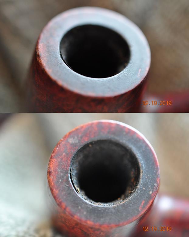 Jeff took photos of the bowl and rim top to show the cake in the bowl. The smooth rim top showed thick coat of lava that filled in the rim top and hopefully protected the edges from damage. He took photos of the top and underside of the stem showing the tooth chatter, scratching and oxidation on the stem surface and wear on the edges of the button.