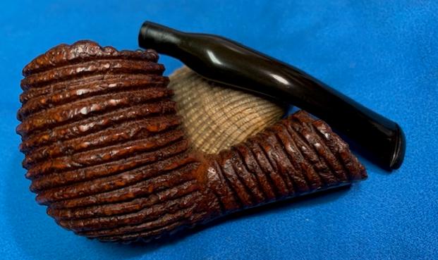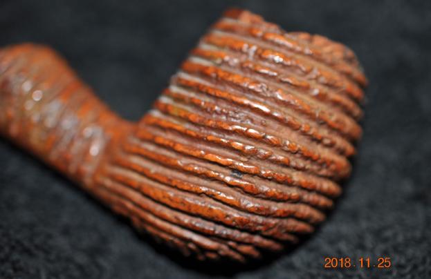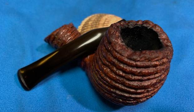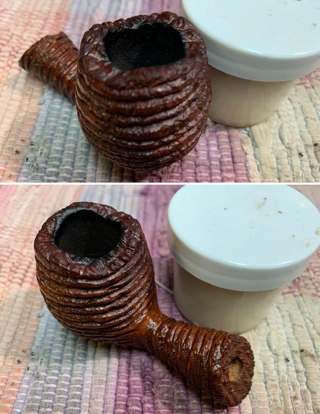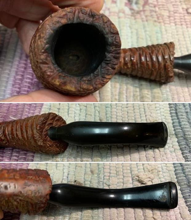 The next pipe I chose to work on was a bowl sans stem that is interestingly rusticated and reads Stone Age K11 [over] shape number 609 followed by Italy on a smooth panel on the underside of the shank. The shape number reminded me of a Savinelli number but I was not certain. It was purchased in November, 2018 from a fellow in Scottsdale, Arizona, USA. It has been sitting in my box of bowls since that time. Jeff cleaned it up and mailed it to me. It is another pipe that I have been postponing restemming for a while. This morning while going through my collection of stem I found one that fit the pipe. At least it works for me! When I found the stem I pulled the bowl out of the box and set aside to be the next pipe to work on. It has a very unique rustication that is quite different – both rugged and spun that reminds me of a honey swizzle stick. The flared shank and rim top both look like rusticated plateau – faux or real, I am unsure. Overall it is a pretty pipe. The bowl had thick cake in the bowl and the rim top had a coat of lava on the inner edge of the bowl and in the grooves of the rim top. The finish had a lot of dust and debris in the valleys of the rustication. I have no idea who made it but it is definitely interesting. Jeff took some photos of the bowl before he cleaned it up.