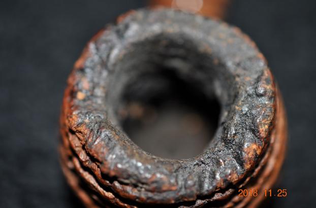 The next two close up photos show the condition of the bowl and rim top. You can see the thick lava coat on the inner edge of the bowl and in the rustication of the rim top.