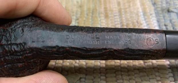 A friend of mine, Scott picked up this deeply sandblasted Dunhill LBS in a shape I would call a Liverpool but Dunhill called a long billiard. He bought it off eBay and when it arrived it had a lot of surprises for him under the thick build up of cake and grime. He has purchased enough estate pipes know what he was getting into but this one had even more issues than he reckoned it would have. He sent me the eBay sellers photos and I have included them below. This is what he saw and honestly if I had seen the pipe I would have sprung for it immediately. The sandblast though dirty, is quite rugged and stunning. The seller dated the pipe as a 1956 based on the following stamping. On the heel of the bowl it was stamped with the shape designation – LBS followed by DUNHILL [over] SHELL BRIAR (Sandblast finish) on the shank. That was followed by MADE IN ENGLAND6 . Next to the shank/stem junction it was stamped with a Circle 4S – the group 4 size designation and the S for Shell Briar.