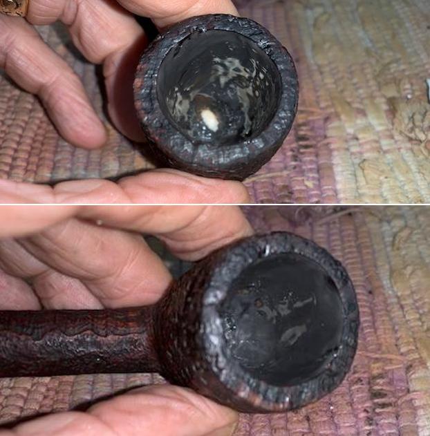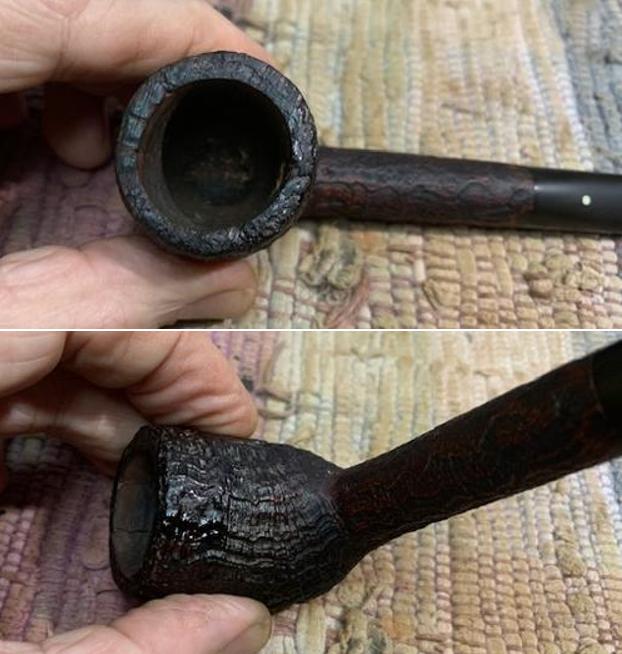 When the pipe arrived at Scott’s place it was in rougher condition than he had expected. Nonetheless he went to work on it. He knew that he needed to ream the cake back to bare briar and clean up the exterior of the bowl to know for sure how bad the damage was on the inside and outside of the bowl. He did a great job cleaning up the exterior and reaming and cleaning out the bowl so the damage on the inside and out were incredibly visible. This pipe was in serious trouble. Scott and I share and affinity for these older craggy Dunhills so he sent me an email. I have included that below.