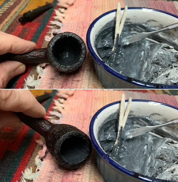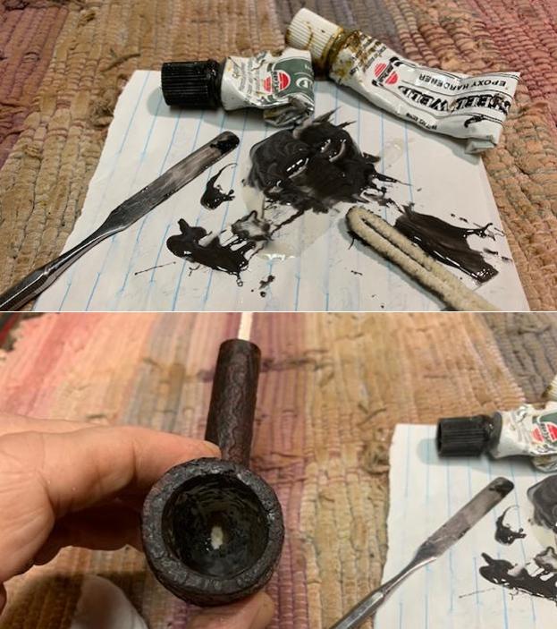 Now it was time to mix a bowl coating. Different folks used different things for this. I use a mix of sour cream and charcoal powder. I learned this from a pipe maker friend. I use it on a bowl that I have repaired with JB Weld because when I sand the bowl it is very smooth and I want to facilitate the building of a carbon cake. The bowl coating does that. Surprisingly it cures neutral in taste and imparts no flavour to the tobacco when smoked. Within a few bowls it is basically covered with the developing cake. It works for me!