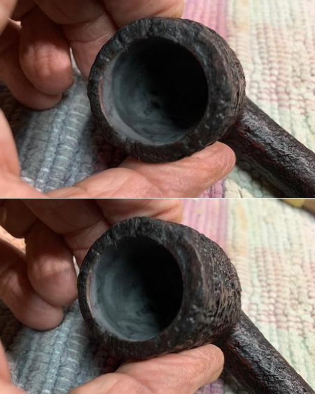 I applied the mixture to the bottom and walls of the bowl with a folded pipe cleaner. I paint it on and smooth it out with the pipe cleaner. I am not looking for a thick coating of the product but merely a top coat. Too thick a coat will just peel off when the pipe is smoked. I want it to stay put for a few bowls anyway!