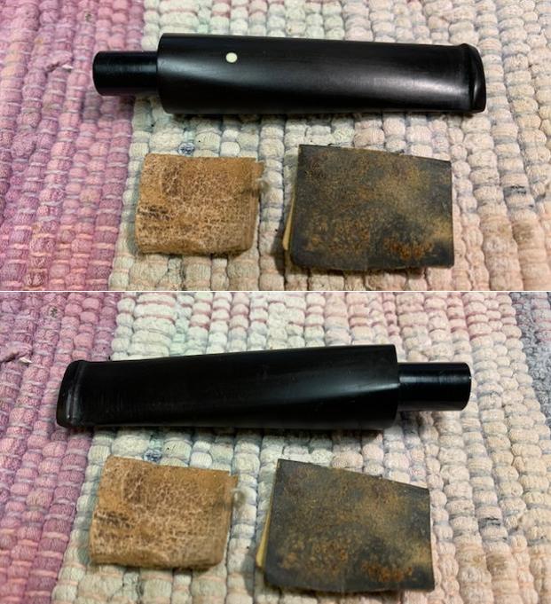 I cleaned the interior of the bowl and shank with pipe cleaners, cotton swabs and isopropyl alcohol to remove my sanding debris and residual tars and oils in the mortise and airway. I cleaned the internals of the stem the same way. Once finished the pipe was clean and repaired inside and out.