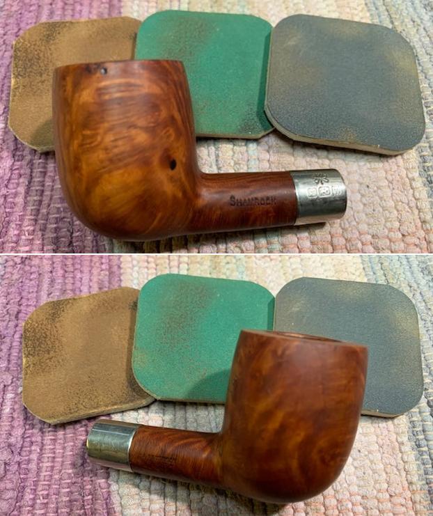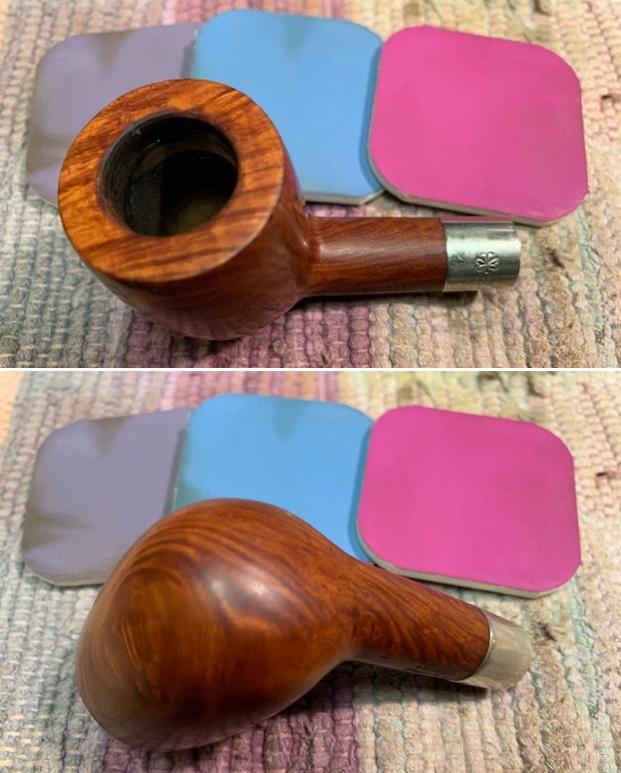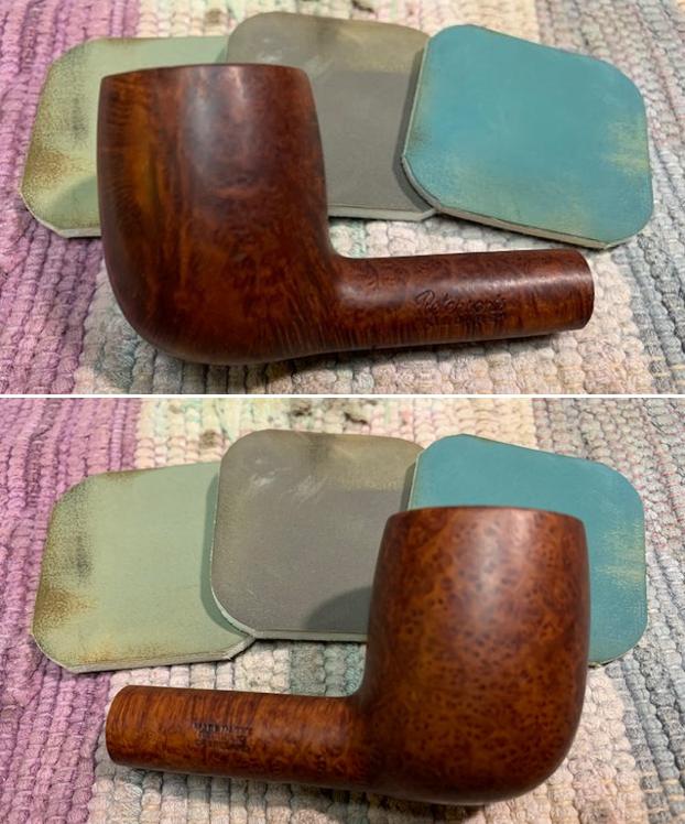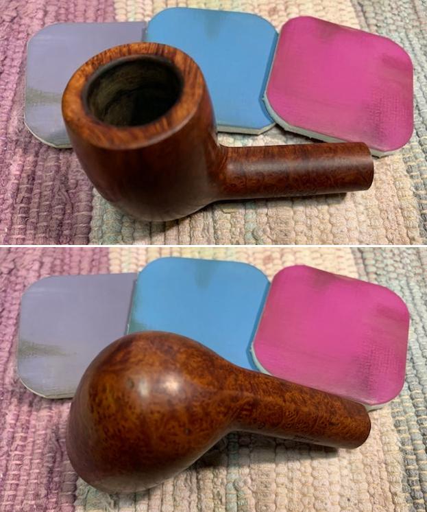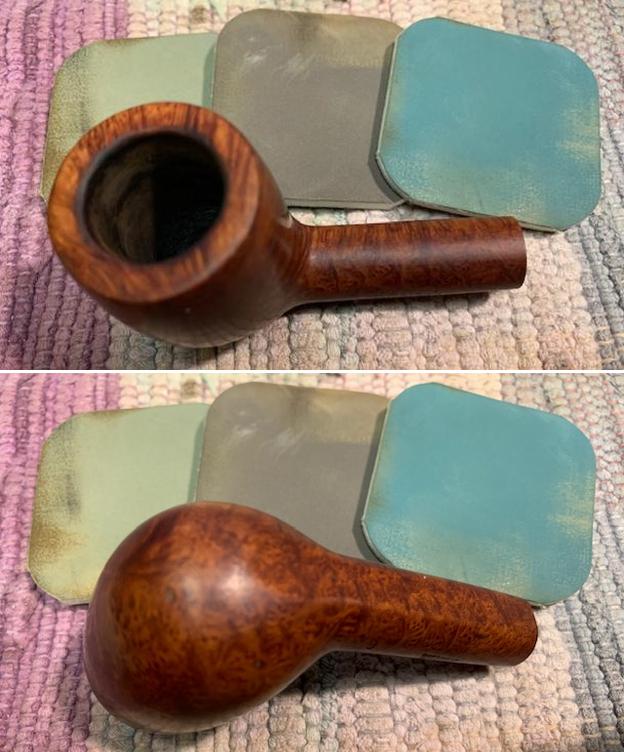 After 15 minutes or so, the stummel is buffed with a microfiber cloth to remove the excess Balm. It takes a bit of work, but the bowl looks better; and for now, I will think about adding any additional coloring. I move on.