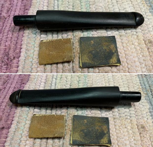 Next, the full regimen of 9 micromesh pads is used starting with wet sanding with pads 1500 to 2400. Following the wet sanding is dry sanding with pads 3200 to 4000 and 6000 to 12000. I apply Obsidian Oil between each set of 3 pads to further condition the stem and to guard the vulcanite from developing oxidation.