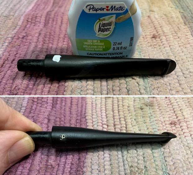 Next, 240 sanding paper is used to surgically remove the excess glue from the acrylic surface. My caution is to do hopefully little damage to the ‘BC’ cap stamp removing the glue. After beginning to remove the excess patch material sanding with 240 paper, I noticed a separation in the crack. It seems that the extended time the acrylic cap was cracked, the acrylic was memorizing the expanded orientation. The excess glue over the crack was serving as reinforcement for the patch and when removed, the patch faltered.