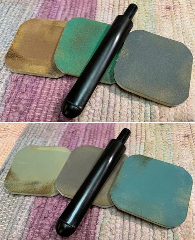 Next, to create an attractive contrasting in the rusticated surface, the 1500 grade micromesh pad is employed to sand the peaks of the rusticated peaks. This creates a reddish fleck contrasting that I like in a rusticated surface.
