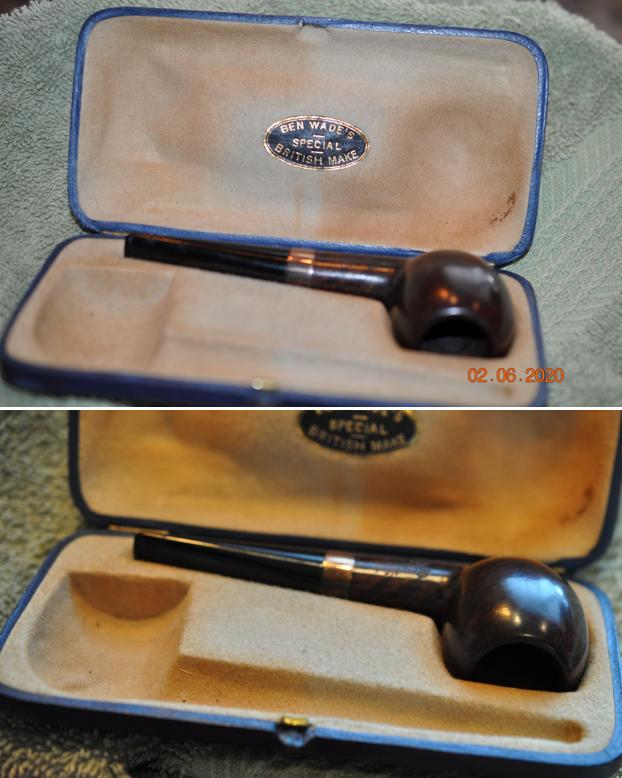 You have seen the work we have done on the Dunhills, Hardcastles, H. Simmons all briar billiard and BBB pipes from the lot but there are still more. The above photo shows a Ben Wade’s Special British Make Pipe Case with a single pipe in it. The single pipe is a Ben Wade De Luxe Apple with a Gold Band on the shank. It is a perfect fit for the cut out in the case.