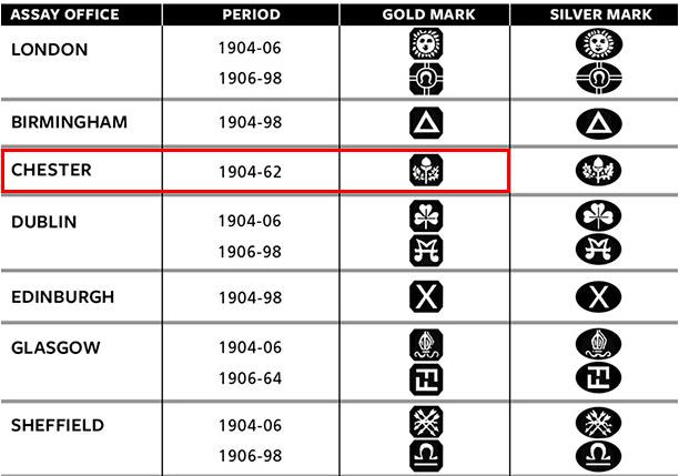 This gold banded Ben Wade is stamped on the left side of the shank and reads Ben Wade in script over De Luxe. The stamping is clear and readable and there is no shape number evident. The gold band is also stamped and reads BW in an oval which is the sponsor’s mark (Ben Wade) followed by a series of hallmarks as noted. The first is a thistle in a shield like the gold mark in the chart below denoting Chester. The mark was used from 1904-1962 (I have drawn a red box around it in the chart below).