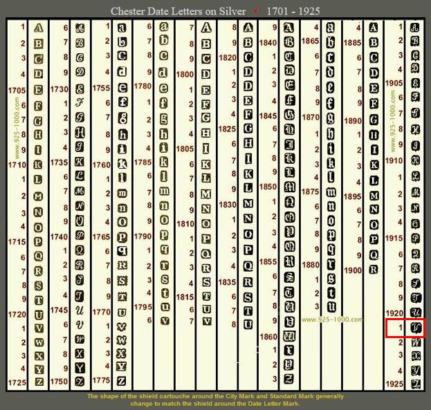 The link took me to the date chart (https://www.925-1000.com/dlc_chester.html). I have included it below. Note that it says Silver at the top but according to the site it is used on both gold and silver. The cartouche with a upper case V with a flourish identifies the pipe being made in 1921. I have drawn a box around the letter in the chart below.