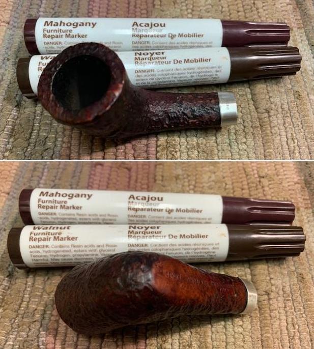 The stem has been waiting for attention. The earlier soak in the Briarville Stem Oxidation Remover worked well. There is almost no tooth chatter but a small bite mark on both the upper and lower button. Simple sanding will address this.
